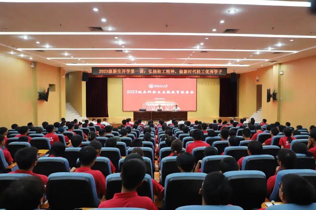 9月28日上午,学校校长王敦球以“弘扬桂工精神,做新时代桂工优秀学子”为题为2023级全体新生讲授开学第一课,系统梳理太阳集团2138办学历史,帮助新生深入了解校史校情,增强爱校荣校兴校意识,为同学们度过有意义的大学时光指明方向。授课以“线上+线下”相结合的方式进行,在雁山校区图书馆报告厅设主会场,在各二级学院、南宁分校设16个视频分会场,各学院党委副书记、学工组长、团委书记、新生辅导员、全体2023级本科生新生共同聆听。