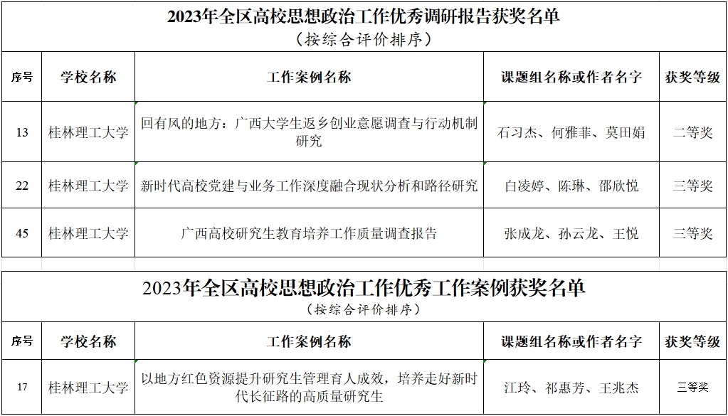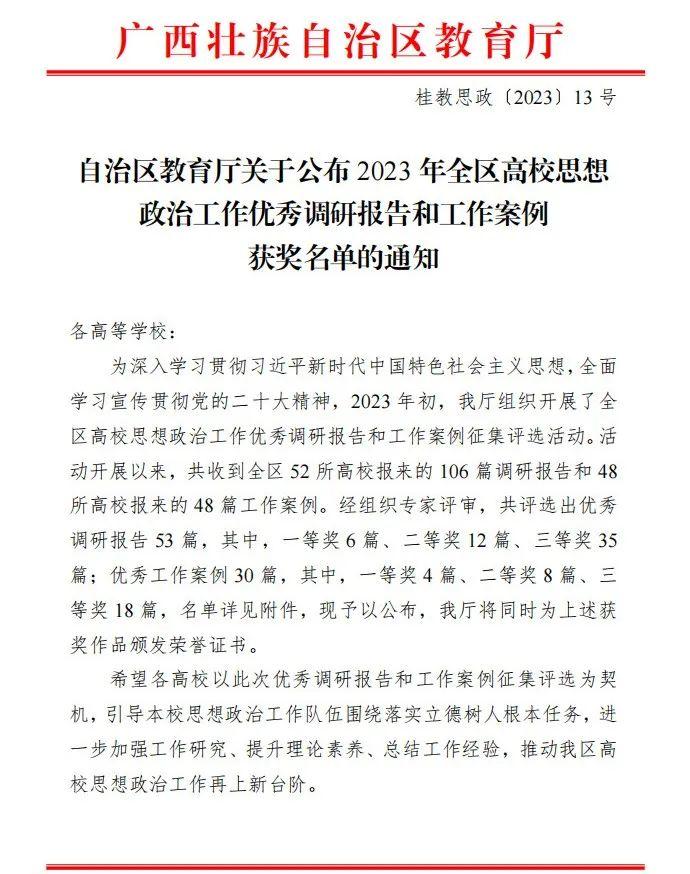 近日,自治区教育厅公布了2023年全区高校思想政治工作优秀调研报告和工作案例获奖名单,太阳集团2138报送的《回有风的地方:广西大学生返乡创业意愿调查与行动机制研究》荣获优秀调研报告二等奖,《新时代高校党建与业务工作深度融合现状分析和路径研究》《广西高校研究生教育培养工作质量调查报告》分别荣获优秀调研报告三等奖,《以地方红色资源提升研究生管理育人成效,培养走好新时代长征路的高质量研究生》荣获优秀工作案例三等奖。