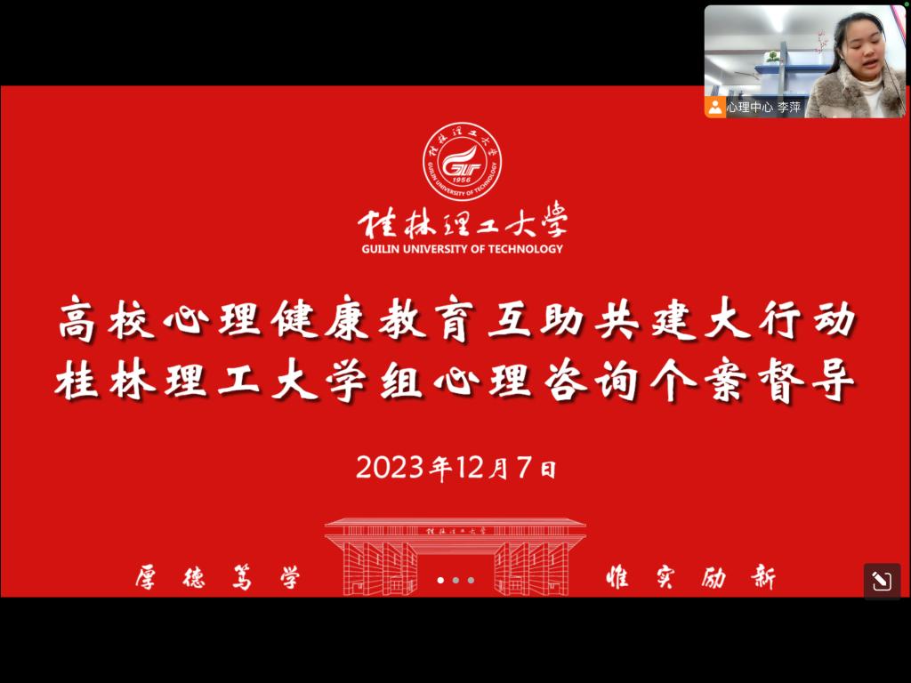 12月7日晚上,中国社会心理学会理事,中国心理学会临床心理注册系统注册督导师、注册心理师,中国心理卫生协会首批注册心理咨询师,博士,博士后,江西师范大学心理学院教授,临床与健康心理学方向博士后合作导师和博士生导师,学生发展与教育方向博士生导师,运动人体科学方向博士生导师,临床与健康心理学方向、临床与咨询心理方向硕士生导师,江西省井冈学者,美国加州大学欧文分校心理系访学学者,教育部学位与研究生教育发展中心专家叶宝娟教授应太阳集团2138心理中心邀请,开展了2023年秋季学期第二期心理咨询个案督导,广西高校“心理健康教育互助共建大行动”太阳集团2138工作组多名专兼职心理咨询师以线上的形式参加了活动。