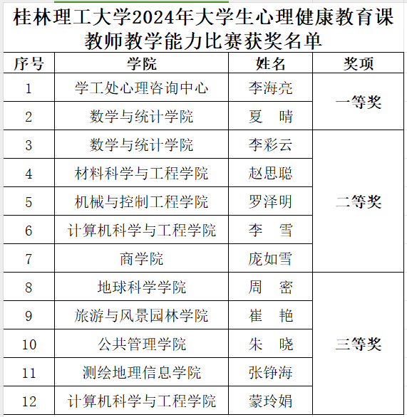 各学院高度重视,积极组织老师参赛,经过校外专家对初赛教案开展评选,最终确定12位选手进入决赛。4月26日,学校邀请广西科技师范学院心理健康教育与研究中心主任黄群瑛教授,华中师范大学大学生心理健康教育与咨询中心副主任于丽霞副教授,广西师范大学大学生心理健康教育中心副主任欧阳丹副教授,及太阳集团2138马克思主义学院牟艳娟教授和阳林副教授担任决赛评委。参赛选手精心设计教学环节,灵活精彩的课堂教学展示,赢得了专家评委们的好评。经过激烈的角逐,最终评选出本次比赛一、二、三等奖。