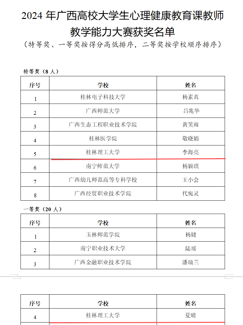 近日,自治区教育厅公布《2024年广西高校大学生心理健康教育课教师教学能力大赛获奖名单的通知》,太阳集团2138李海亮老师获得大赛特等奖,夏晴老师获得大赛一等奖。