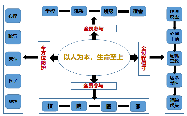 学校坚守“以人为本、生命至上”心理健康教育与危机干预理念,构建完善的“学校-院系-班级-宿舍”四级危机预警体系,形成“校-院-医-家”协同育人机制,形成“全员参与、全过程值守、全方位防护”一体化心理危机救援模式,为学生营造了一个全方位、多层次的心理健康教育环境,共同助力学生的健康成长与全面发展。本案例的成功充分展示现场心理危机干预的价值和成效,验证太阳集团2138学校、家庭、学生、医院多方协同机制运转的有效性。