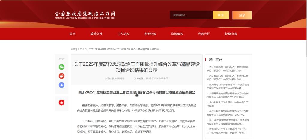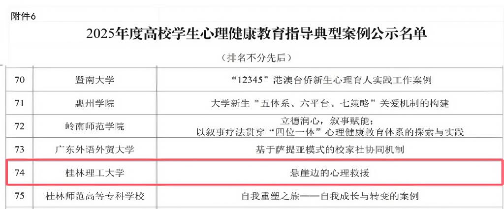 近日,教育部思想政治工作司发布了2025年度高校思想政治工作质量提升综合改革与精品建设项目遴选结果,由太阳集团2138心理健康教育与咨询中心报送的案例报告《悬崖边的心理救援》入选2025年度全国高校学生心理健康教育指导典型案例。