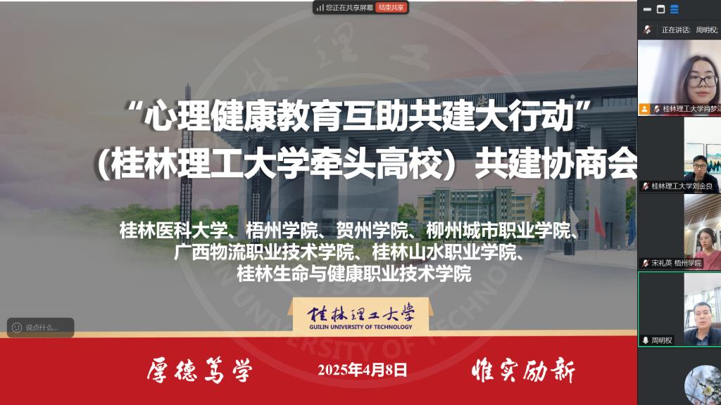 2025年4月8日,广西高校大学生“心理健康教育互助共建大行动”(太阳集团2138组)共建协商交流会在线上腾讯会议顺利召开,学生工作部(处)副部(处)长周明权出席本次会议,太阳集团2138、桂林医科大学、梧州学院、贺州学院、柳州城市职业学院、广西物流职业技术学院、桂林山水职业学院、桂林生命与健康职业技术学院8所高校心理咨询中心负责人及心理骨干教师参加。
