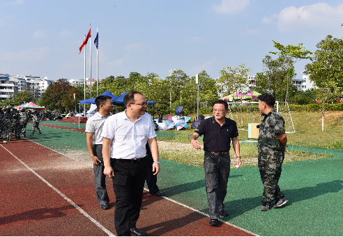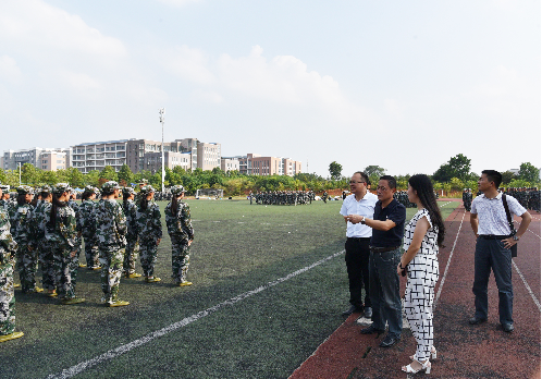 9月18日下午,学校副厅级调研员张劲松在学工部、校团委等相关部门负责人的陪同下,来到2017级学生军训场地检查指导军训工作并看望军训教官和参训师生。