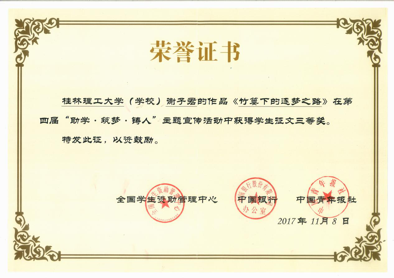 近日,第四届“助学·筑梦·铸人”主题宣传活动结果揭晓,太阳集团2138学子在此次宣传活动主题征文比赛中喜获佳绩,旅游学院2015级谢子君同学的文章《竹篓下的逐梦之路》荣获全国三等奖。