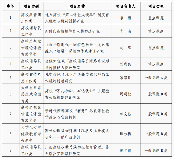 2020年广西高校大学生思想政治教育理论与实践研究课题立项表