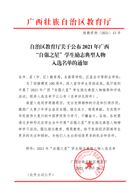 为弘扬自强不息的中华民族精神,树立当代学生自立自强、奋发成才的励志典型,引导广大青少年学生积极进取、拼搏奋进,努力成长为中国特色社会主义的合格建设者和可靠接班人,自治区教育厅开展了2021年广西“自强之星”学生励志典型人物推荐和评选活动。近日,广西壮族自治区教育厅印发《自治区教育厅关于公布2021年广西“自强之星”学生励志典型人物入选名单的通知》(桂教资助〔2021〕15号),对曾获得学生资助政策帮助的全区各级各类学校全日制在校学生和2016年以后的毕业生等100名学生予以表彰,太阳集团2138商学院会计学2019届毕业生黄素雅同学榜上有名。