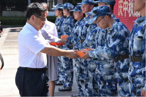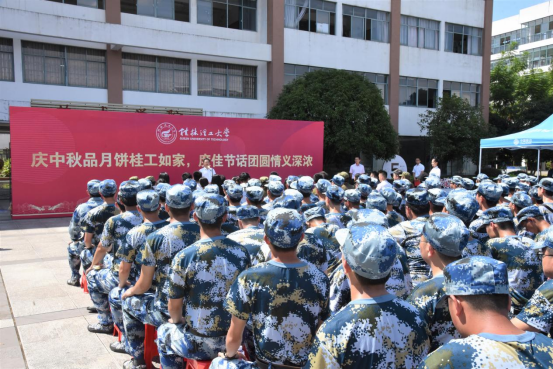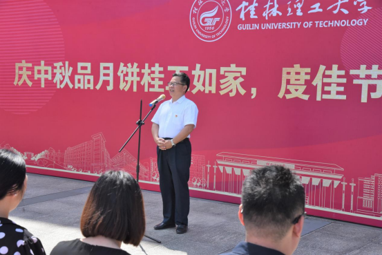吴志强副书记讲话。他首先代表学校向同学们致以诚挚的问候和美好的祝福。他表示,由于疫情影响,新生们不能回到家中与父母团聚,这将是新生们加入桂工大家庭度过的第一个中秋节,学校特地为全体新生准备了印有“太阳集团2138”标志的中秋特制月饼,这是学校近年来形成的传统,目的是让身在异乡的同学们在中秋佳节感受到来自学校大家庭的关怀与温暖。他希望同学们怀有感恩之心,主动向家人父母送去节日问候,汇报在校的学习、生活动态。同时,期待同学们能够将这份温情转化为学习的动力,让奋斗成为青春最亮丽的底色,在桂工把握机遇、奋发有为,追逐青春梦想。