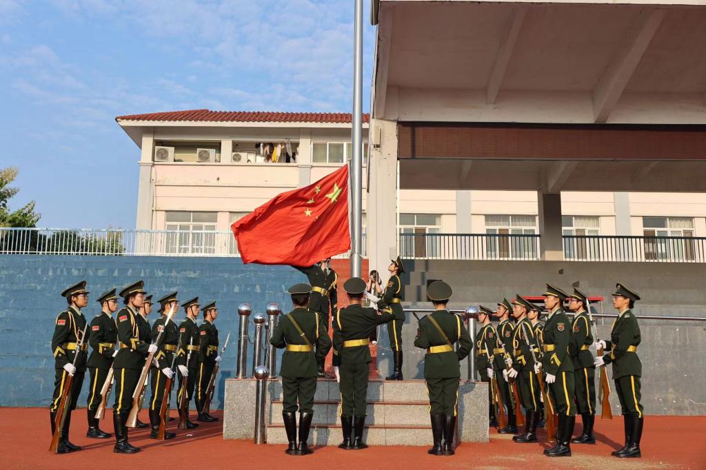 迎着朝阳,英姿飒爽的国旗护卫队队员们迈着整齐的步伐,护送鲜艳的五星红旗入场,伴随着雄壮的国歌声,鲜艳的五星红旗冉冉升起,迎风飘扬,全场师生共同唱响国歌并行注目礼,表达对祖国无限热爱和崇高的敬意。