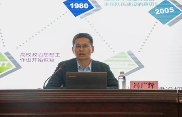 报告会上,冯广辉部(处)长还结合自身学生工作经历,深刻阐述了辅导员双线晋升制度设计,全面解读了新时代思想政治教育主抓方向,围绕辅导员职业发展和生涯规划,提出辅导员要用好科研团队、年级工作组、辅导员素质能力大赛等平台,坚定职业信念,在辅导员队伍建设上做好职业化、专业化的递进发展。