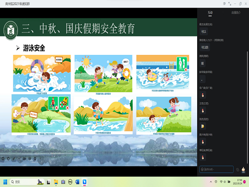 为进一步加强中秋国庆小长假学生的安全稳定工作,9月14-9月27日,商学院组织辅导员、班主任,以线上线下两种途径,全覆盖开展安全主题教育。