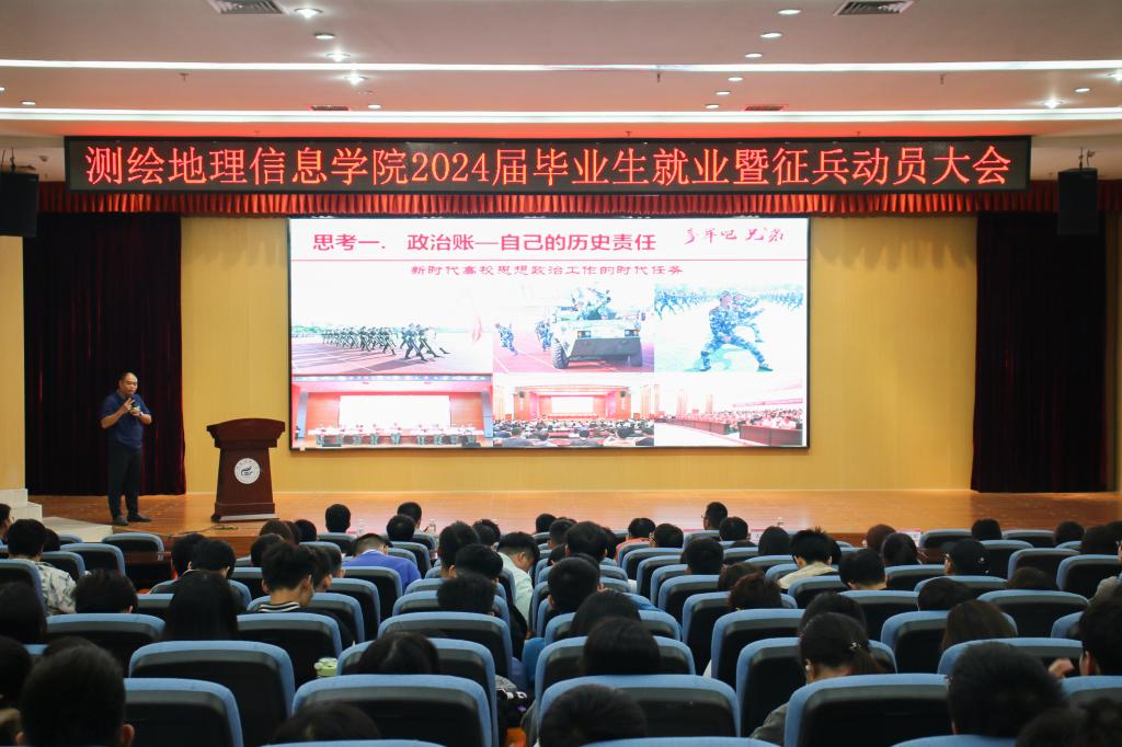 为深入贯彻落实党中央、国务院、教育部、自治区教育厅关于做好高校毕业生就业创业工作决策部署,加快推进2024届毕业生高质量充分就业,进一步加强征兵工作的动员力度,10月11日下午,测绘地理信息学院在雁山校区图书馆报告厅召开2024届本科毕业生就业暨征兵动员大会。学院党委书记李景文、学院院长刘立龙、学校武装部副部长黄海、学院团委书记徐嘉辉、地信教研室副主任姜建武、优秀本科毕业生代表及全体2024届毕业生参加了会议。