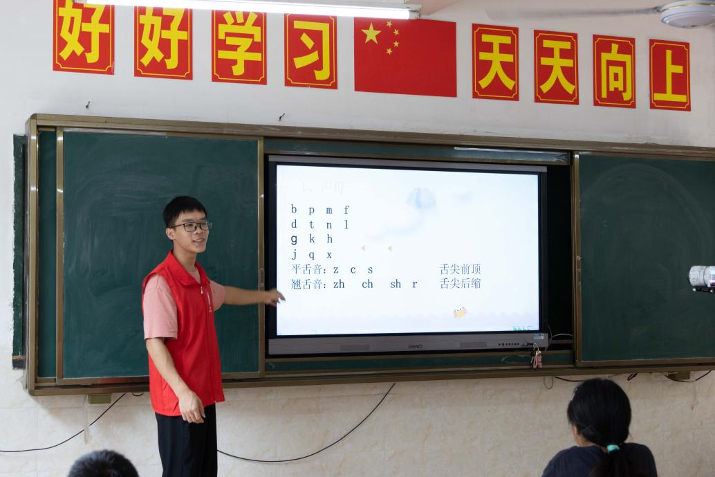 在阳朔县葡萄镇西岭村和灌阳县黄关镇商家村,实践团面向当地小学各族留守少年儿童通过开设形近字和同音字辨别方式教学,普通话绕口令和顺口溜游戏等方式,精心准备普通话认知教学和推广等公益课堂活动;为留守儿童发放拼音字画本、拼音挂表、拼音注音故事话本等学习工具,增强留守儿童的获得感,提高留守儿童对普通话的认知和情感认同;依托学校艺术团,组织服务队员们精心排练含有普通话元素的青春舞蹈、小品、歌唱文艺节目,为留守儿童献上文艺演出的视觉盛宴与精神甘霖。