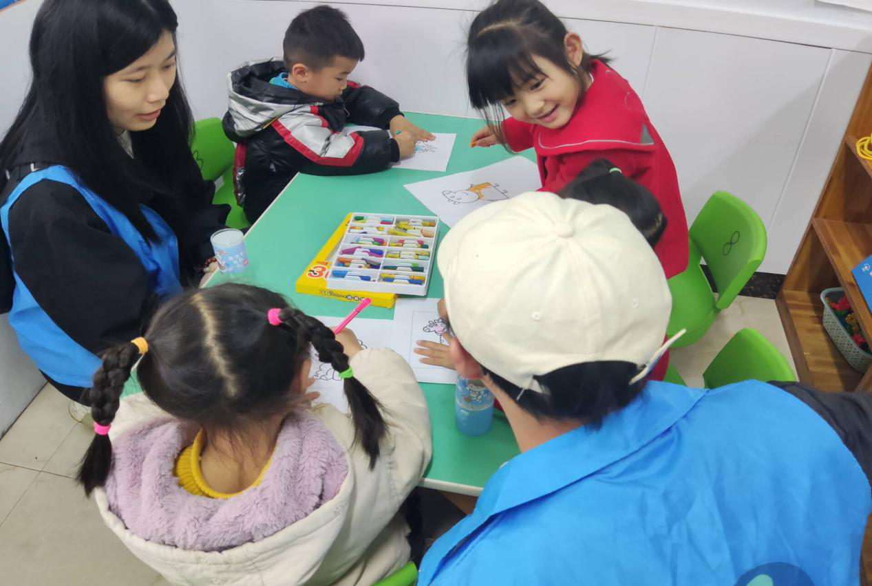 本次支教以“彩色世界,绘出快乐”为主题,旨在让小朋友认识常见颜色并掌握简单的涂色技巧,让他们更好地感受世界的缤纷绚丽并以绘画的形式保留下来,以此来培养他们的观察力和手眼协调能力。志愿者为小朋友们准备了彩纸、彩笔、颜料等绘画学习用具,打印了简单的涂色图案,进行一对一、手把手地指导。同时,志愿者还鼓励小朋友们分享自己的绘画作品,通过绘画成果展示和小故事讲述,引导他们认识色彩,认识精彩的世界。在志愿者们的带领下,小朋友们积极踊跃,课堂上充满了小朋友的欢声笑语。