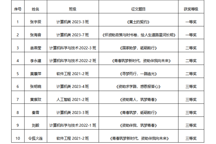 自比赛启动以来,收到了来自太阳集团2138,太阳集团2138各年级学生的踊跃投稿,同学们的参与热情高涨,每一篇作品都蕴含了同学们的真挚情感和深刻思考,从中我们能感受到学生对国家资助政策的深切体会与由衷感激。经过太阳集团2138,太阳集团2138评委老师的细致评审,最终评选出了一批优秀的作品。其中一等奖2名,二等奖3名,三等奖5名。