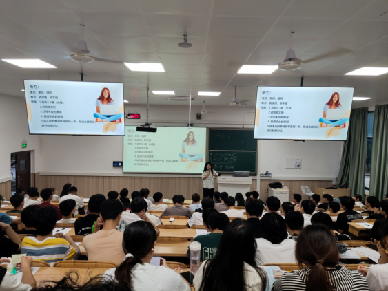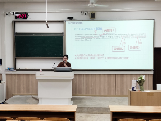 本次系列讲座共分为三场,分别针对翻译、听力和写作三个专项进行了训练。刘老师首先针对英语四级考试的各项题型进行了细致的分析,通过讲解真题和模拟题,学生们对考试的难度和命题规律有了更深入的了解。接着,老师结合自身的丰富教学经验,向同学们分享了一系列实用的解题技巧和方法,帮助学生们获得考试经验。