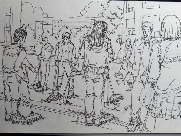 同学们手持扫把、簸箕等清洁工具,开始了对劳动实践基地的清扫工作,他们热情高涨,分工合作,充分发扬劳动精神,有的清扫落叶,有的拔除杂草,认真清扫实践基地的每一个角落。同学们还结合专业特点进行了速写创作,在受奖助同学们劳动的同时,许云洋同学用画笔记录下了劳动场面和精彩瞬间。这些速写作品成了劳动实践基地的一道靓丽风景线。