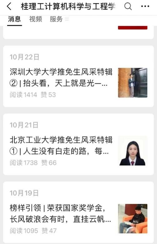 学院依托“桂理工太阳集团2138,太阳集团2138”微信公众号,推送“榜样引领”优秀获奖个人经验分享栏目、“推免生风采”特辑以及“入学100天|关于TA们的大学故事”,每篇推文平均阅读量1000+,通过生动形象的个人故事向学生分享有效的学习方法和积极的生活态度,营造崇尚先进、学习优秀、争创先锋的良好氛围。
