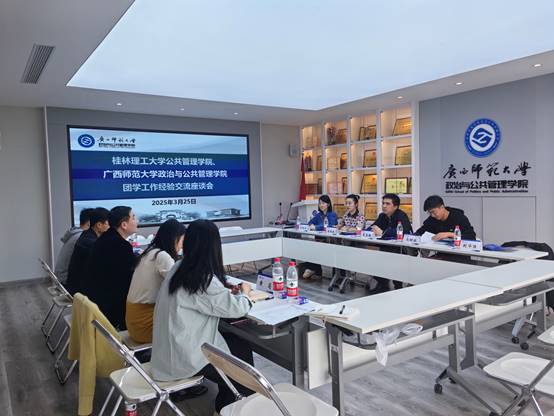 3月25日,公共管理学院赴广西师范大学政治与公共管理学院开展交流座谈,双方学院党委副书记、学工组长、团委书记、团委副书记、专职辅导员、组织员齐聚一堂,围绕党建、学生工作、团委工作等展开深入探讨并分享经验。