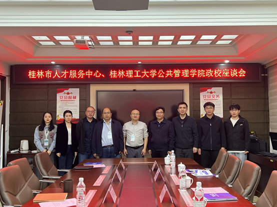 4月9日,公共管理学院党委书记陆平带队赴桂林市人才服务中心开展访企拓岗促就业专项活动,并进行座谈交流。党委副书记夏勇超、学工组长马树振、团委副书记封华强、兼职辅导员徐泽,桂林市人才服务中心副主任莫逆、毕业生就业服务部部长熊耀成、副部长张灵、主管朱思娜、桂林盛才人力科技有限公司运营总监李永清参加座谈。