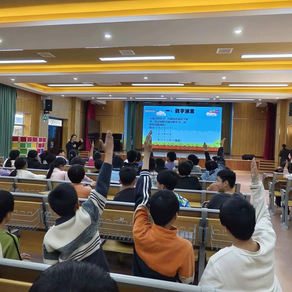 为确保教学实效,扬帆社提前半月启动志愿者选拔工作,通过教学能力测试、课程设计展示等环节遴选出12名优秀志愿者,并开展三轮岗前培训。活动当天,随着主持人以“数学魔法师”的角色登场,课堂瞬间化作知识探索的乐园。“数学游戏竞赛”环节采用分组竞技模式,孩子们在“24点速算”“数独迷宫”等活动中展现惊人运算能力;“数学魔法秀”通过三维几何模型拼接、概率转盘实验,将抽象概念转化为可触可感的立体认知;在“数学侦探社”情景教学环节,原本腼腆的学生在志愿者引导下主动担任“小队长”,带领组员破解趣味数学谜题。活动现场既有屏息凝神的专注时刻,也有破解难题时的欢呼雀跃,精心设计的奖品更让每个孩子感受到智力探索的成就感。