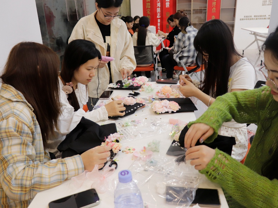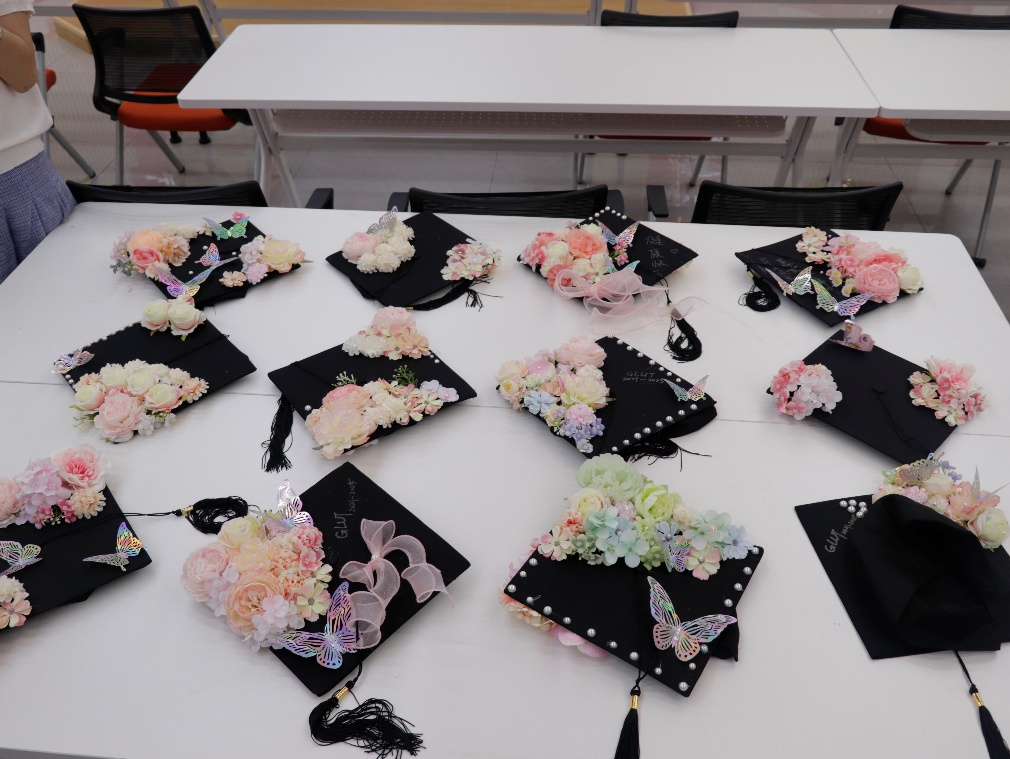 活动现场,学院提前准备了丰富多样的装饰材料,包括色彩鲜艳的绸带、精致的仿真花朵、闪亮的装饰珠片等,为毕业生们打造个性化学术帽提供充足素材。学生充分发挥想象力和创造力,他们或是将花朵错落排列,或是用绸带编织出特别的图案,现场气氛热烈,大家相互交流、相互帮助,在协作中共同完成了充满个性与意义的毕业作品。