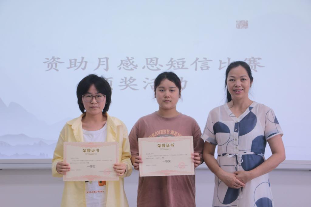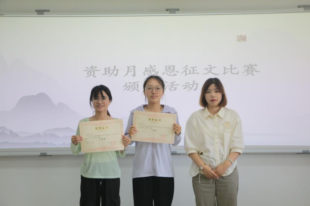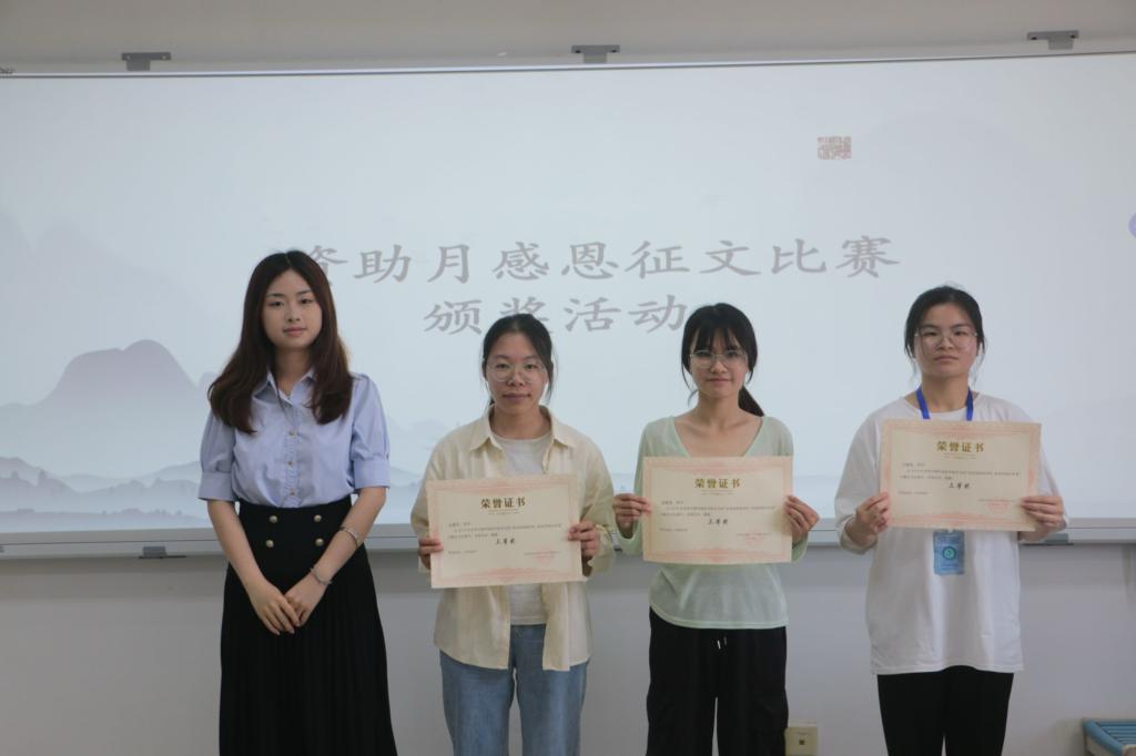 为深化感恩教育,增强资助育人实效,发挥榜样引领作用,6月5日中午,外国语学院在04305教室隆重举行“资助月”系列感恩教育活动颁奖仪式,为感恩短信、征文、家书、演讲四项比赛画上圆满句号。众多获奖同学分享了他们对国家及社会资助的深切感恩之情。
