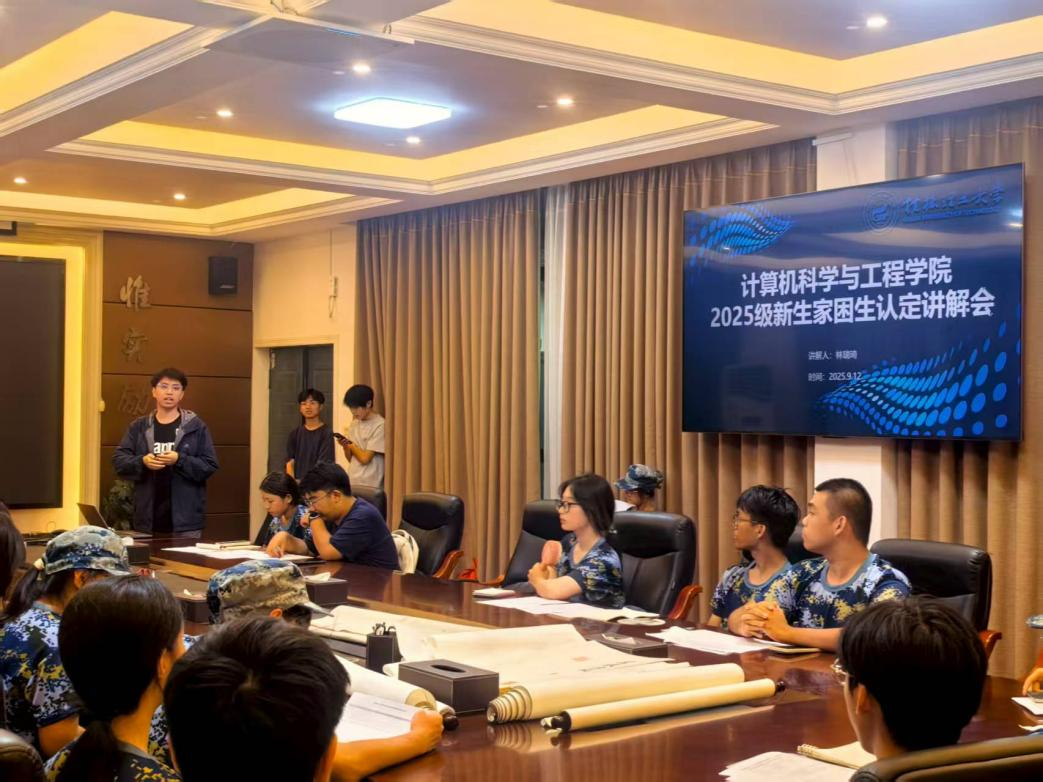 为深入贯彻落实国家及学校关于学生资助工作的决策部署,切实打通资助政策传递的“最后一公里”,帮助 2025 级新生全面掌握家庭经济困难学生认定流程与资助政策细则,9月13日晚,计算机学院在02507会议室举行2025级新生资助政策培训会暨家庭经济困难学生认定讲解会。本次会议由学院学生事务中心资助部精心筹备,学院资助工作负责老师劳家宝、资助部成员及全体新生班级资助负责人共同参会。