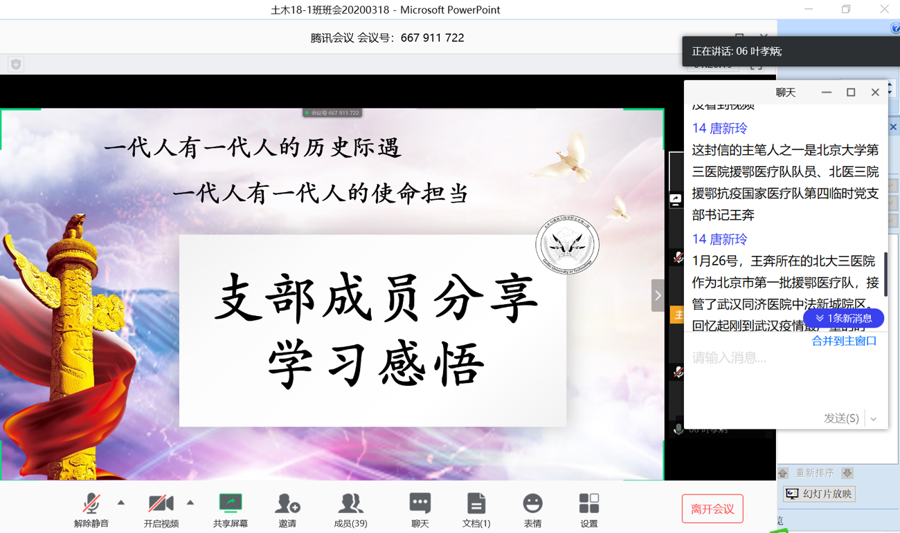近期,土木与建筑工程学院组织学生团支部线上学习领会习近平总书记给北京大学援鄂医疗队全体“90后”党员的回信精神。支部成员了解学习习近平总书记的回信原文后,纷纷发表自己的感受及领悟,分别从各自的视角畅谈了学习领悟习近平总书记回信精神的心得体会。