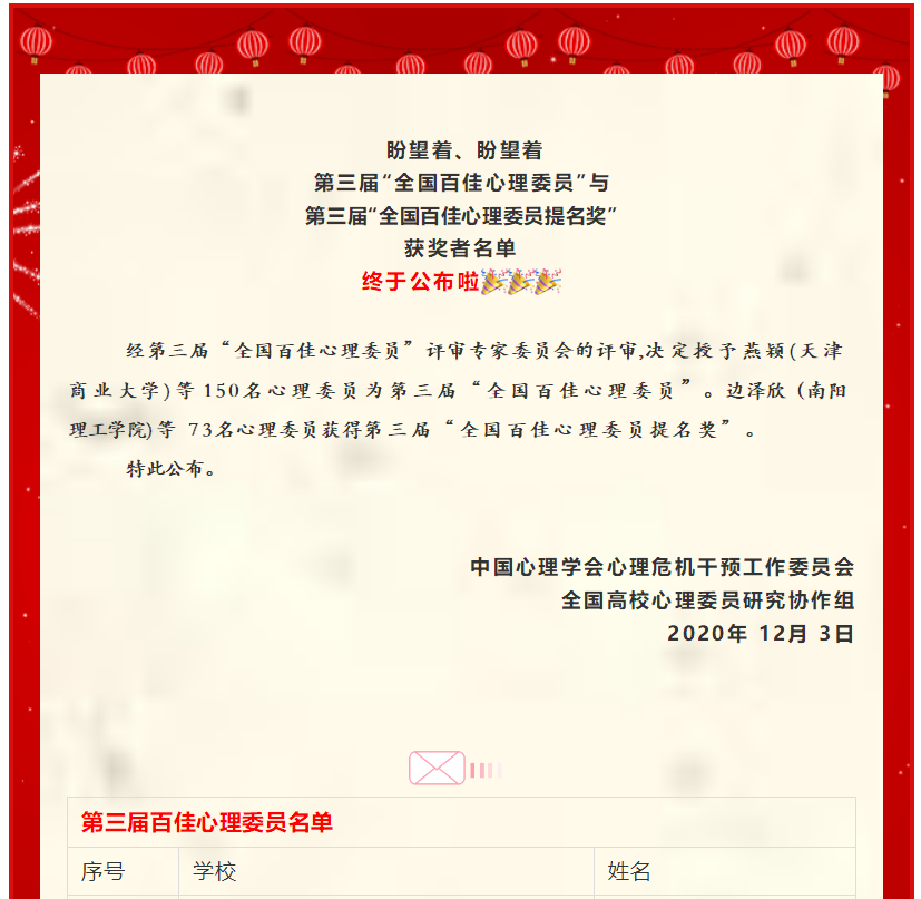 2020年11月22日至25日,因疫情影响,第十五届全国高校心理委员工作研讨会暨朋辈心理辅导论坛通过ZOOM会议室在线上举行。地球科学学院地质工程18-1班潘俐傧同学荣获“全国百佳心理委员奖”。