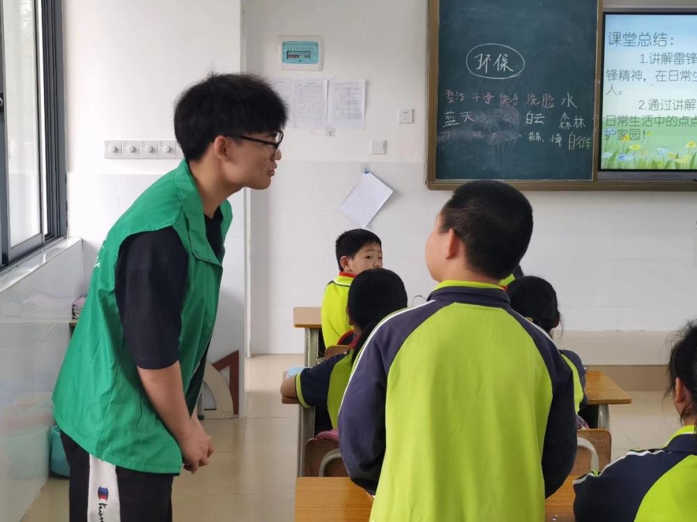 由环境学院团委·学生会的20名志愿者组成的支教团于4月15日12:50统一乘车前往北芬小学,下午14:00开始授课,本次共有4个班级参与活动,主要围绕传承雷锋奉献精神,践行环保理念的为主题,课堂上支教团的成员们为小学生们介绍了雷锋的英雄事迹和保护环境的相关知识。课堂上,同学们求知若渴,积极踊跃地回答问题。