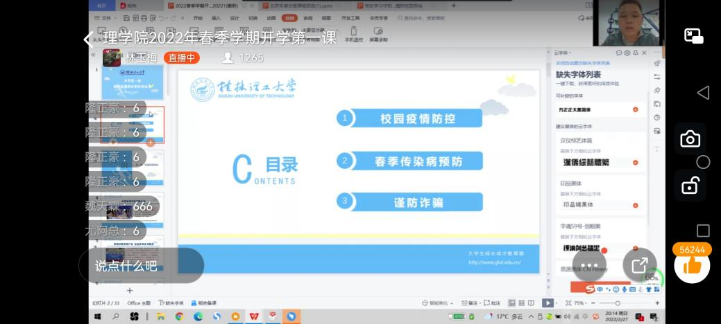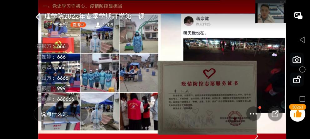 为深入贯彻习近平总书记关于“大思政课”建设的重要指示精神和落实学校2022年春季学期学生返校及疫情防控工作会议精神,进一步做好新学期开学安全稳定工作,助力学生扣好新学期“第一粒扣子”,2月27日,理学院各年级辅导员联力通过钉钉线上直播平台为全体本科生上了一堂思政教育的开学大课和安全教育的警示大课。