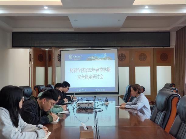 3月22日,材料科学与工程学院在屏风校区2304会议室召开2022年春季学期安全稳定工作研讨会,会议由学院党委副书记徐时主持,全体辅导员参加会议。