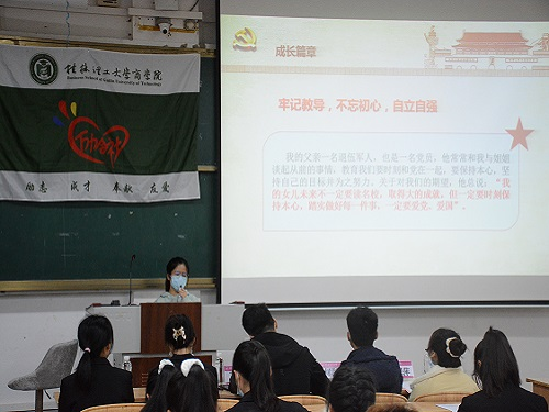 4月16日,商学院于雁山校区06104教室举办以“喜迎二十大,永远跟党走”为主题的资助政策宣传月系列活动之资助演讲比赛,商学院负责资助专项工作的辅导员王贤出席本次活动。