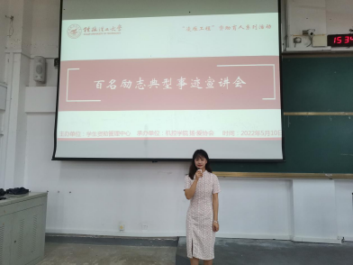 本次活动以“追梦路上,自强不息”为主题,励志典型代表机电2018-2班陈洁在宣讲会上分享了自己的追梦历程和成长感悟。宣讲会上,陈洁介绍了学习科研方面的基本情况,并从学习、工作、生活、社会实践等几个方面向同学们分享了自己的成长经历,讲述自身奋斗过程,分享感悟与收获。