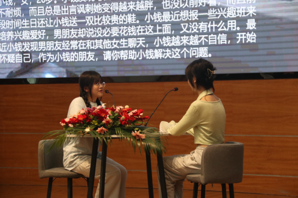 大赛分为播放心理健康教育视频、朋辈心理辅导模拟、观众问答、教师点评、现场颁奖等几个环节。在播放心理健康教育视频环节,通过播放大学生心理公益视频,引起学生对自身心理健康的重视。在心理辅导比赛环节,参赛选手根据抽取到的题目与被访人员进行心理辅导与沟通交流,通过掌握被访人员的心理特征和心理困扰,在访谈中调节其存在心理问题。在观众心理知识问答环节,旨在让观众更加关注心理健康,正确认识心理问题,心理模拟辅导环节结束后,由学院负责心理健康教育的老师对选手们的表现进行了点评和总结。