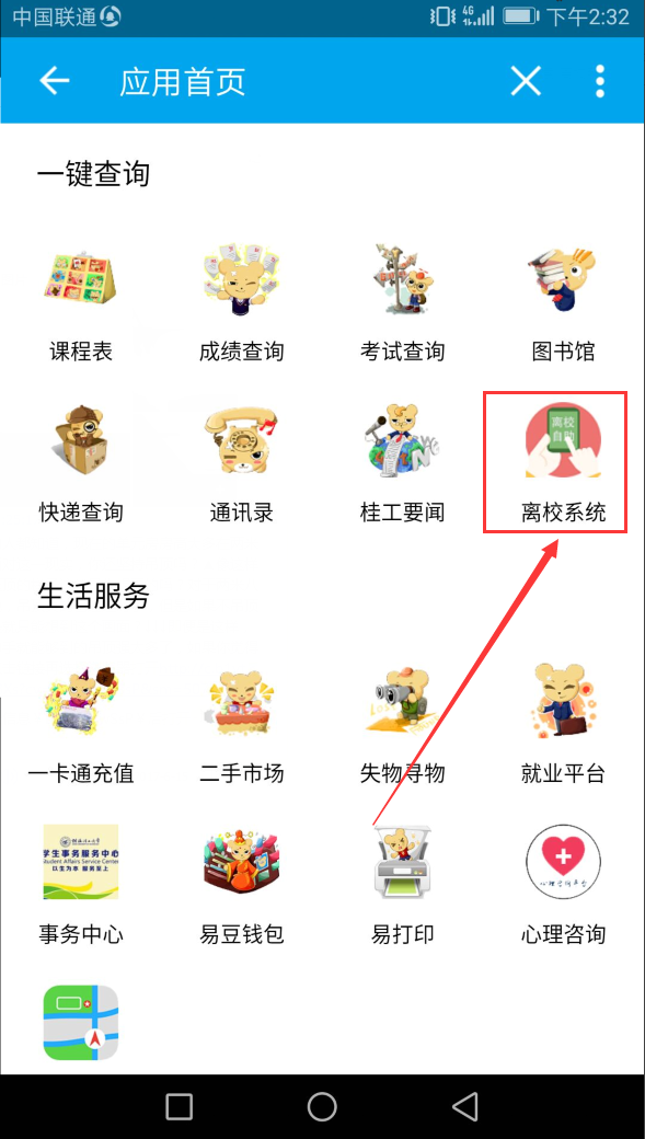 步骤二:在“一键查询”类别中点击“离校系统”