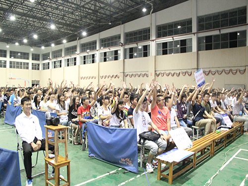 为激发2015级新生的学习热情,在新生群体中树立榜样,9月14日晚,由学生工作部(处)主办、学生工作助理中心承办的2015年秋季学期优秀学生报告团首场宣讲会在综合体育训练馆顺利举行。宣讲会由“创业达人”韦福瑞、“公益好人”欧雷、“学霸超人”陈明月以及“自强之星”甘书杰任主讲。4400多名2015级新生及各学院新生辅导员参加了宣讲会。