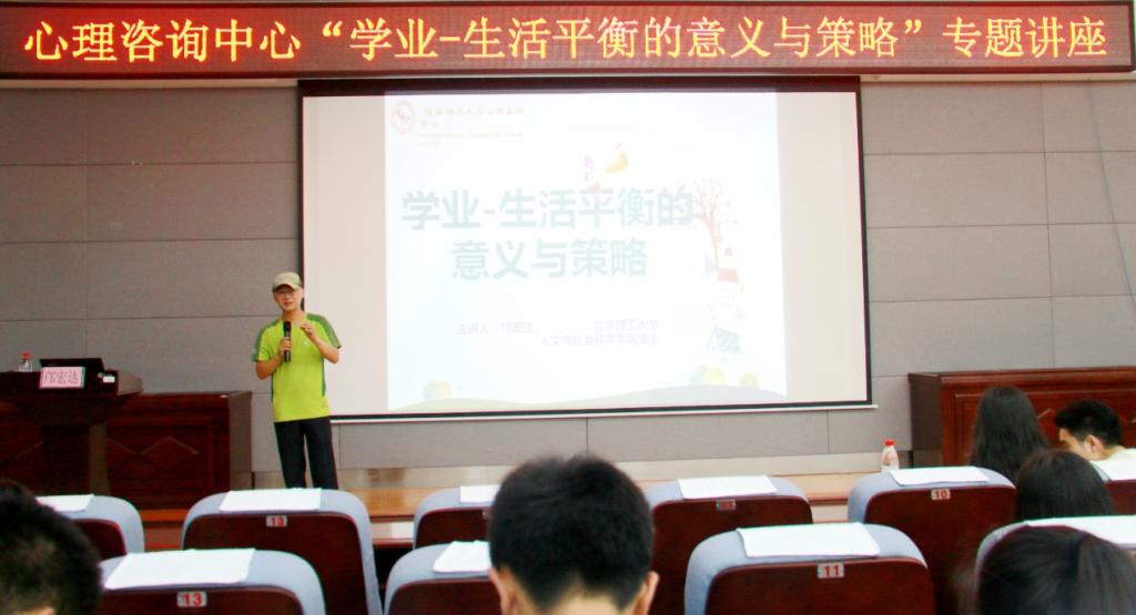 5月29日晚,“5·25心理活动月”系列活动之心理健康教育讲座,在地球科学学院报告厅顺利举办。本次讲座,太阳集团2138心理健康教育与咨询中心,邀请了北京理工大学人文与社会科学学院博士邝宏达老师作为主讲人,为太阳集团2138学生开展“学业-生活平衡的意义与策略”讲座。心理健康教育与咨询中心谭咏梅老师与李海亮老师出席了此次讲座,有近300学生参与讲座。